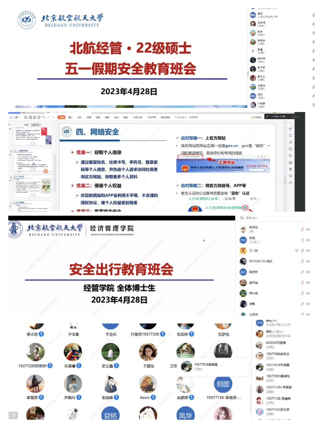 “五一”劳动节假期即将来临,为提高学生的安全防范意识和能力,切实保护学生的人身和财产安全,4月28日,经济管理学院本研各年级召开五一假期安全教育主题班会,布置近期工作,进行五一假期安全教育,学院本研全体同学参加。