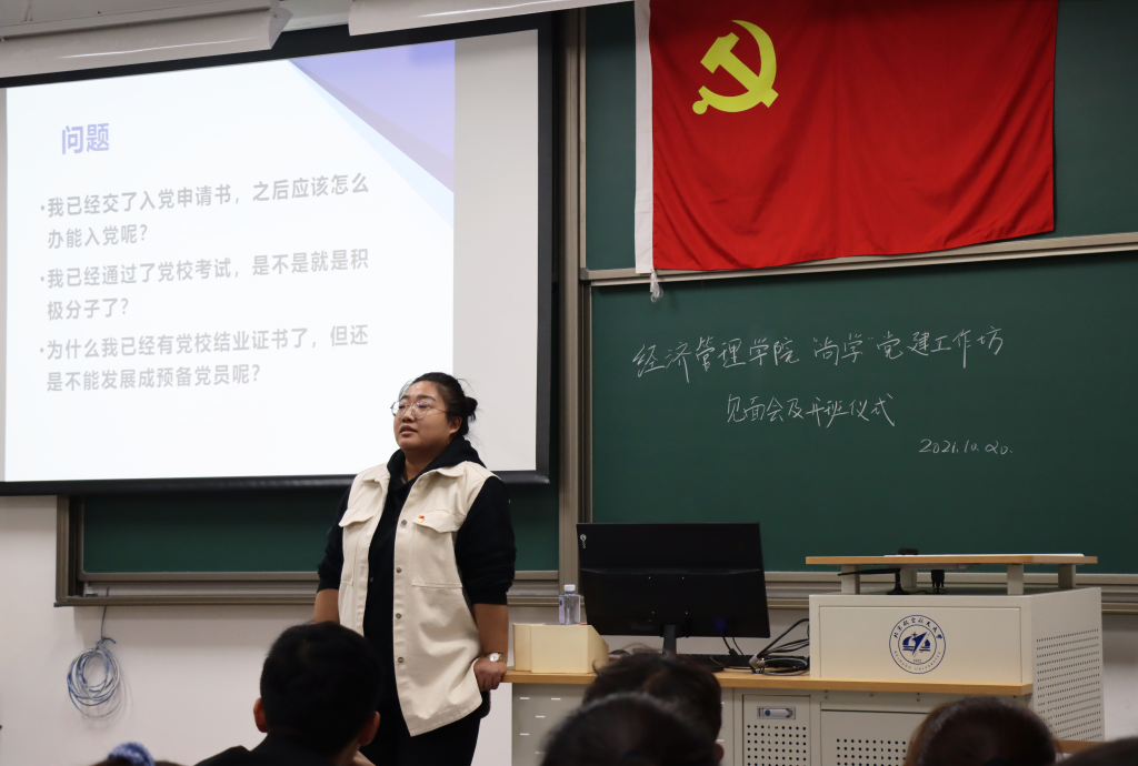 开班仪式结束后,党建工作坊首场培训环节邀请到了学院党建辅导员张慧美老师。张老师开展题为《发展党员全流程》培训会,从六种身份、五个阶段,对发展党员全流程进行了讲解。同时也为大家介绍了党的基层组织、党支部中的成员、党的组织生活等方面的内容。