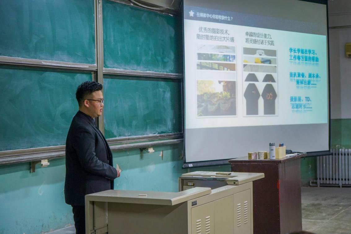 随后,学生党建引领中心、“尚学”学业支持中心、 “敏行”学生实践中心、“经世”学生骨干管理中心、“至善”学生积极心理中心、学生艺体中心、学生资助中心、学生权益中心和学生媒体中心的负责人先后上台,用各具特色的演讲、充满“干货”的分享向大家介绍了各中心的职能特色、组织架构、取得成果以及部门成员,并公布了招新计划和招新要求。宣讲人们用或幽默、或睿智、或热情、或稳健的个人魅力向2020级的同学们展示学生工作对大家的锻炼成果,并用生动活泼的语言鼓励大家去挑战不曾尝试过的工作领域。宣讲会的最后,曹泽鸿辅导员再次上台,对朱鹏宇老师、参与宣讲的各部门负责人表示感谢,并再次诚挚表示希望大家积极加入九大中心这个大家庭。