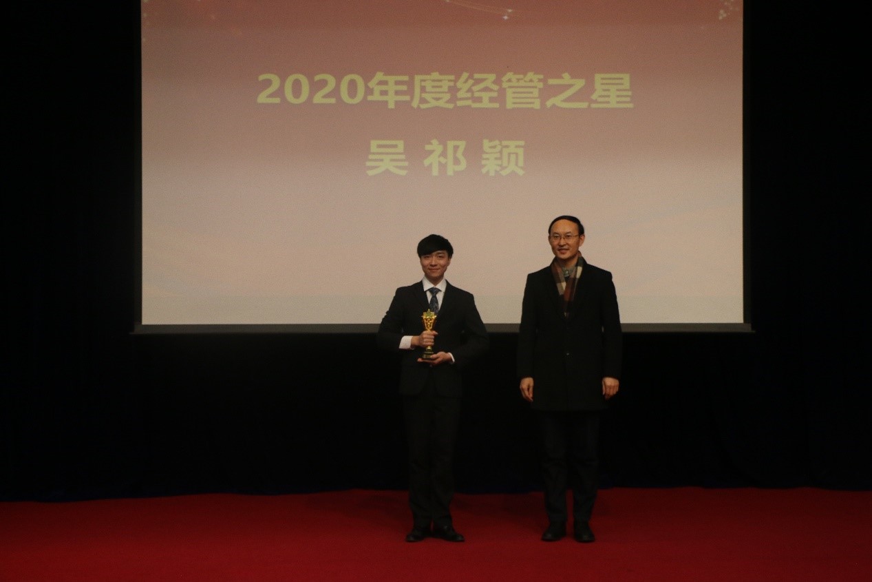 最后,副院长秦中峰为经管学院本科生年度最高荣誉“2020年度经管之星”获奖人——2017级吴祁颖同学颁奖。