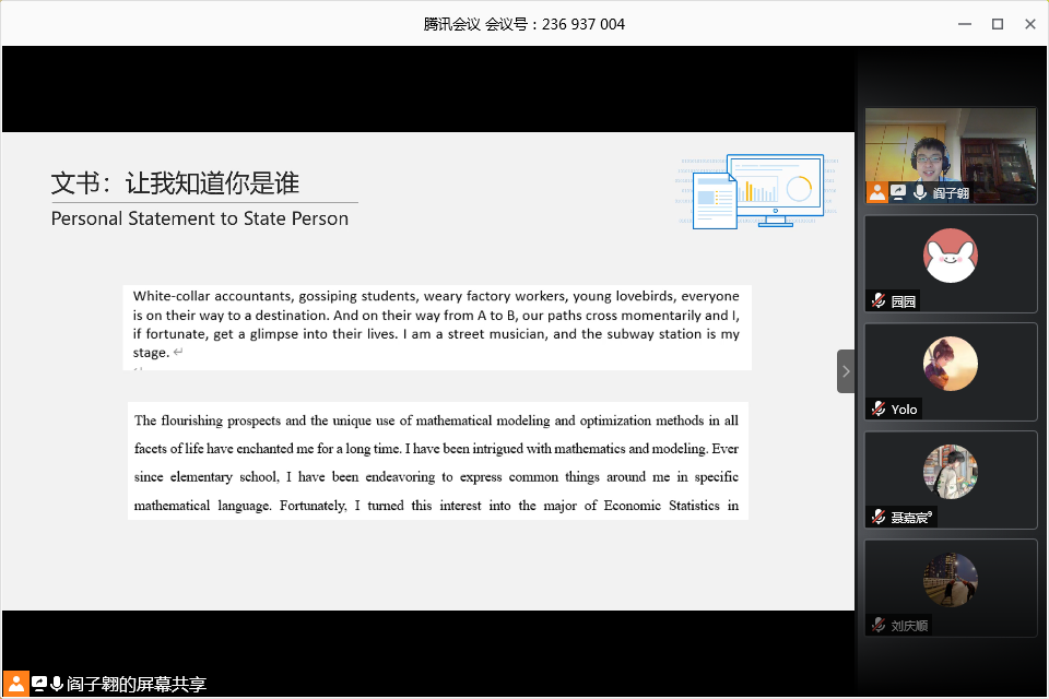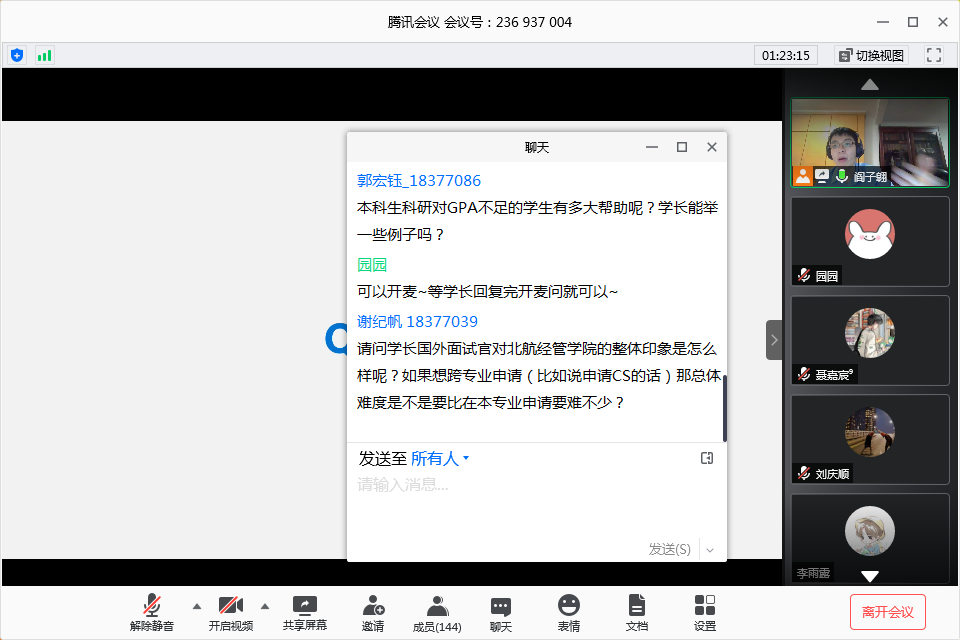 2020年5月13日15:30,“格局与细节——北航八系本科生如何破局出国申请”主题博雅课程顺利举办,本次博雅课程面向经管学院所有年级开放,以腾讯会议线上直播形式开展。本次活动由辅导员白雪主持,经济管理学院本科三个年级160余名学生参加了此次活动。此次活动特别邀请了经济管理学院优秀校友、哥伦比亚大学19-20年度招生大使阎子翱和同学们交流分享。