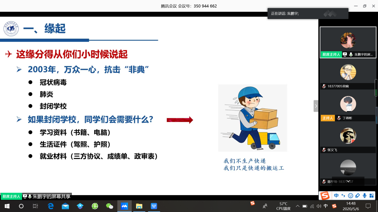 最后,朱鹏宇导员以聊天的形式,以“我在北航开驿站”为切入点,与同学们分享导员们在此次疫情中的所作所为所感。本来准备除夕前回家的朱导,想到一旦推迟返校同学们在家可能有种种不便之处,便决定留在学校等一等学校安排,看自己留在学校能不能为同学们提供一些帮助,没想到这一等就等到了夏天,导员的“驿站”为全国各地的经管学子提供了不少帮助。