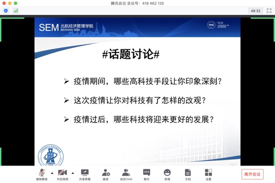 2020年4月29日14:00,Mentor U1S1系列活动之科技抗疫交流会顺利举办,本次活动面向经管学院所有年级开放,以腾讯会议线上直播形式开展。本次活动由辅导员张园园主持,经济管理学院本科三个年级150余名学生参加了此次活动。此次活动特别邀请了经济管理学院在读博士、经济管理学院博士生辅导员唐鹏飞和同学们交流分享。