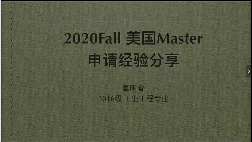 之后,董明睿学长从个人情况、申请心得分享、现阶段建议、选校建议、关于中介五个方面来分享自己的经验。学长强调要重视课程成绩,尽早讲语言考到理想成绩,同时要重视任何⼀个可能丰富申请背景的机会。
