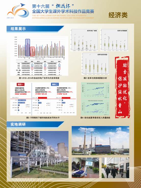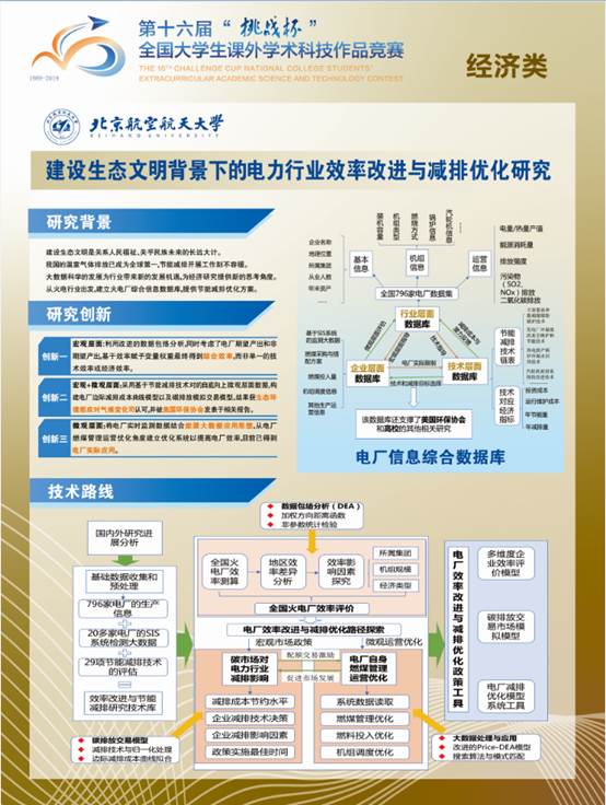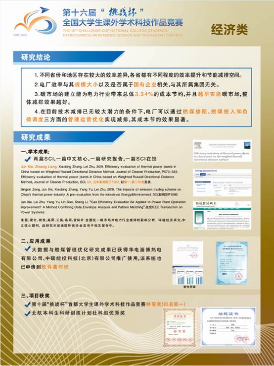 全国213所高校的447件作品参与角逐,北航经济管理学院朱磊老师指导的本科生团队(谢俊、梁壮、潘睿之)作品《建设生态文明背景下的电力行业效率改进与减排优化研究》,作为学校唯一社会科学类项目参与决赛角逐。在决赛中,战胜了三十余所高校的优秀项目,斩获特等奖!
