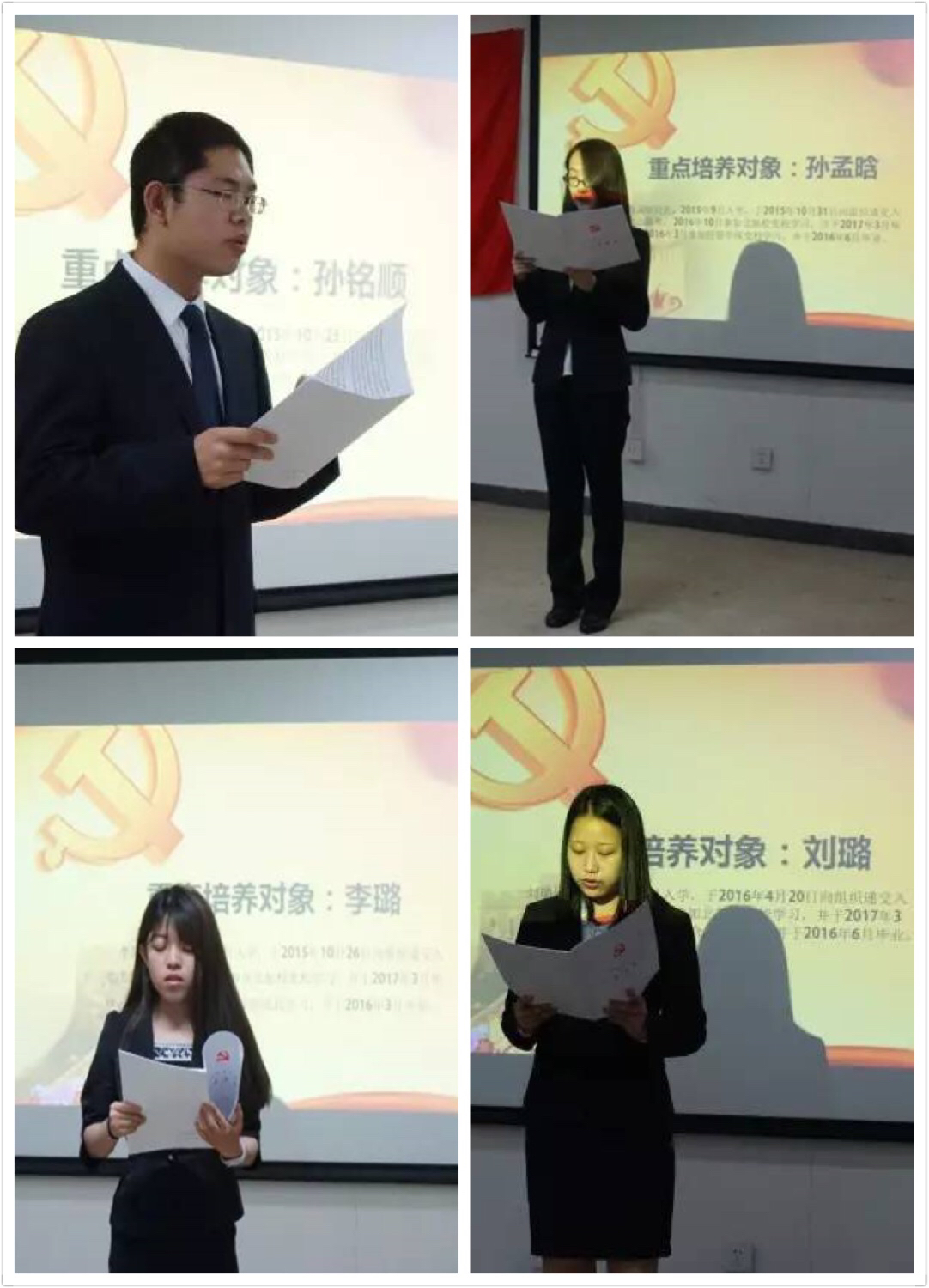 大会第三项,讨论是否接受孙孟晗、李璐等7位同志为预备党员。首先申请人孙孟晗、李璐等七名同志分别宣读了入党志愿书,从对党的认识、反省自身缺点、表达入党愿望及决心等方面进行了汇报。