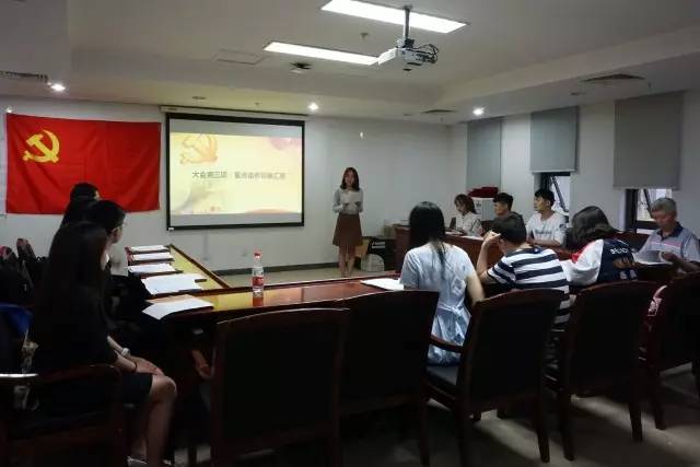 大会第一项,由党支部书记王晨同志汇报大会出席情况,文管基础部应到党员15人,实到党员15人,大会确认有效。大会第二项,全体起立,唱国际歌。