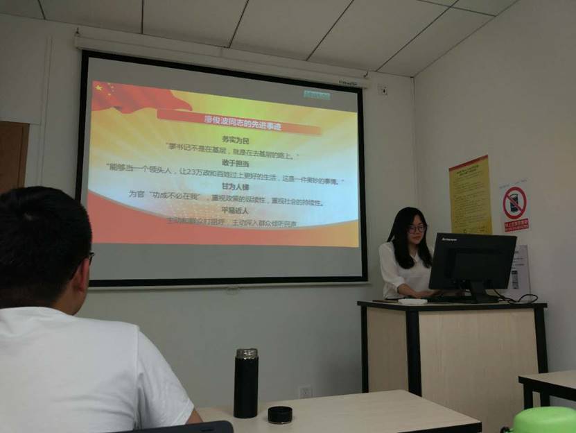 支部会议第二项,学习重要会议文件精神。学习内容主要包括五个部分:学习学校第十六次党代会会议精神,学习2017学校年度工作会会议精神,学习廖俊波同志的先进事迹,“两学一做”学习教育常态化制度化,学习习近平总书记在中国政法大学讲话的重要精神。首先俎富豪同志带领大家学习第一、二项内容。俎富豪同志就第十六届党代会进行了总结,主要包括第十五次党代会以来的工作回顾、工作体会和不足以及下一步工作建议,并就其会议精神进行了深刻的理解,发表了自己的见解。俎富豪同志还朗读了2017年学校年度工作会会议精神中“撸起袖子加油干”等精彩段落。接下来赵婧羽同志带领大家学习第三、四项内容。赵婧羽同志首先为我们讲解了廖俊波同志的先进事迹,带领大家着重学习其务实为民、敢于担当、甘为人梯和平易近人的重要精神。紧接着她又对“两学一做”学习教育常态化制度化的重大意义等进行了讲解。最后黄淑慧同志带领大家学习第五项内容,她就五四青年节前夕习近平总书记访问中国政法大学的重要讲话进行了分析,并讲述了习近平总书记讲话对全国广大青年的重要激励作用。