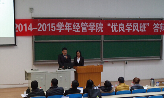 2015年11月29日14:00,2014-2015学年经管学院“优良学风班”答辩会于教0-001正式开始。经管学院分党委副书记王喜忠老师、分团委书记张驰老师、2012级辅导员宋树洋、2013级辅导员于晓、2014级辅导员闫琦、胡杰和2015级辅导员王晨出席本次答辩会并担任评委。本次答辩由赵婧羽同学和郭一鸣同学主持。