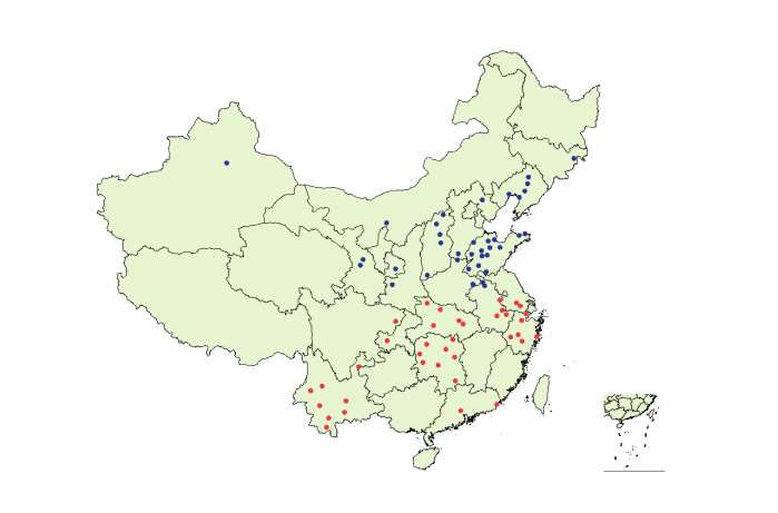 图1.本研究74个城市分布(蓝色为北方城市,红色为南方城市)