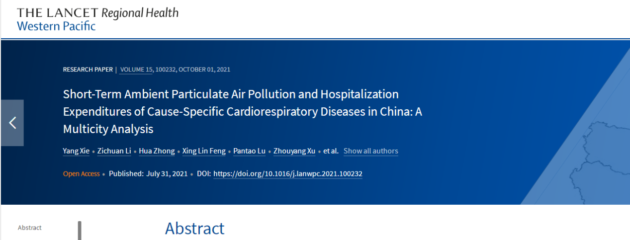 近日,北航经济管理学院谢杨副教授课题组和西安交通大学吴少伟教授课题组合作,对我国部分城市人群短期暴露于大气颗粒物污染导致的额外住院人次和经济负担进行了详细分析,并在《Lancet Regional Health-Western Pacific》杂志发表了题为“Short-Term Ambient Particulate Air Pollution and Hospitalization Expenditures of Cause-Specific Cardiorespiratory Diseases in China: A Multicity Analysis”的论文(http://www.thelancet.com/journals/lanwpc/article/PIIS2666-6065(21)00141-3/fulltext)。