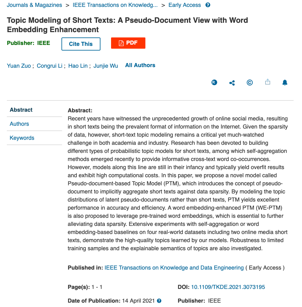 近日,国际数据挖掘顶刊《IEEE Transactions on Knowledge and Data Engineering》(IEEE TKDE)在线发表了我院左源副教授、吴俊杰教授等在短文本语义分析方面的最新研究成果《Topic Modeling of Short Texts: A Pseudo-Document View with Word Embedding Enhancement》。左源副教授为第一作者,吴俊杰教授为唯一通讯作者,北京伊人99经济管理学院为第一完成单位。