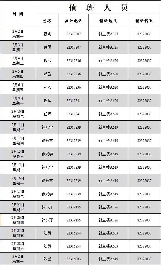 1.学院值班时间为2015年2月2日至3月2日,上午8:30—11:30,下午2:00—4:00(春节法定假日和星期六、星期日除外)。