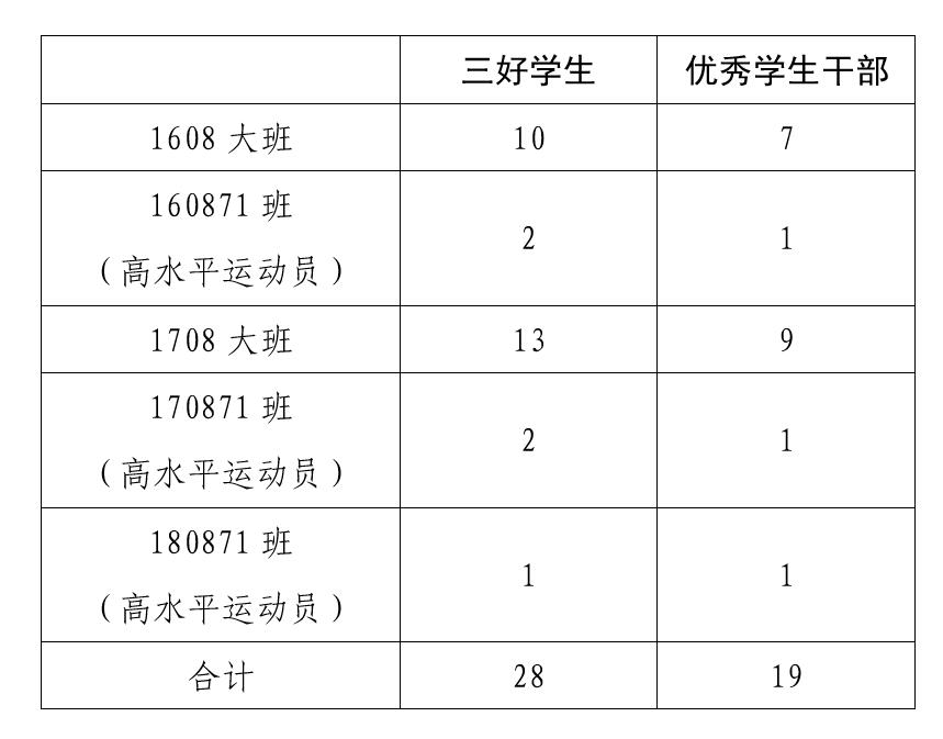学校共下发经济管理学院2018-2019学年校级三好学生名额28个、优秀学生干部名额19个,涵盖2016级、2017级全部本科生和2018级高水平运动员本科生。1808大班本科生三好学生、优秀学生干部的评选工作由致真书院组织实施。休学、保留学籍和延长学制的学生不参加评选。