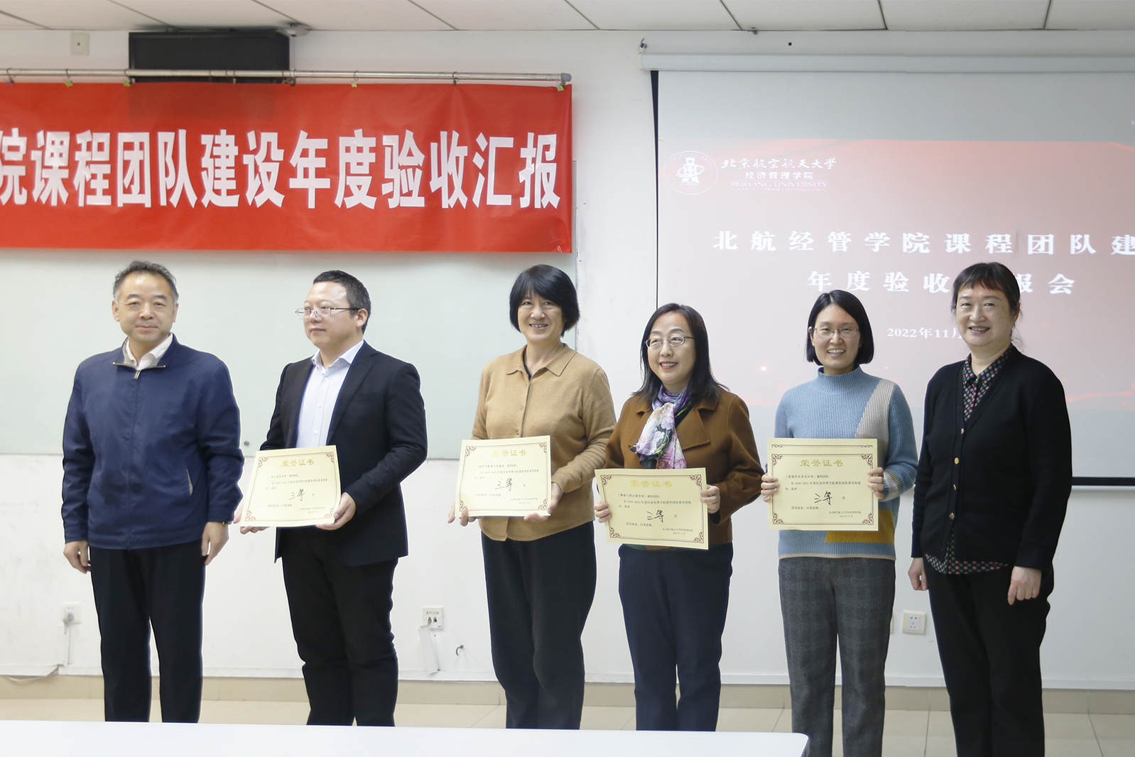 本次课程团队建设验收会的专家组由北航经济管理学院范英院长、国家级课程思政教学名师杨超教授、北航高等教育研究所郑晓齐教授、北航机械电子工程学科付永领教授、经管学院学术委员会主任王惠文教授、北京市教学名师韩立岩教授、经管学院教学督导组贾国柱教授、副院长秦中峰教授等组成。经管学院牟晖副院长主持会议。