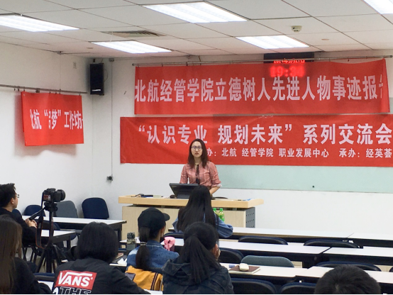 2019年3月27日晚19:30,于新主楼A1048,“认识专业,规划未来”系列交流会暨北航经管学院立德树人先进人物事迹报告成功举办。本次交流会主要面向经管学院研究生一年级的同学,为迎接即将来到的秋季招聘季,我们邀请到了现就职于中国铁路北京局集团有限公司的闫东明学姐,以及拟就职于中国建设银行总行的陶世凯学长和拟就职于德勤华永会计师事务所的张书霖学姐,他们就求职前的准备、求职过程中的经验进行了一个分享,为在校的同学们答疑解惑,树立了求职信心。