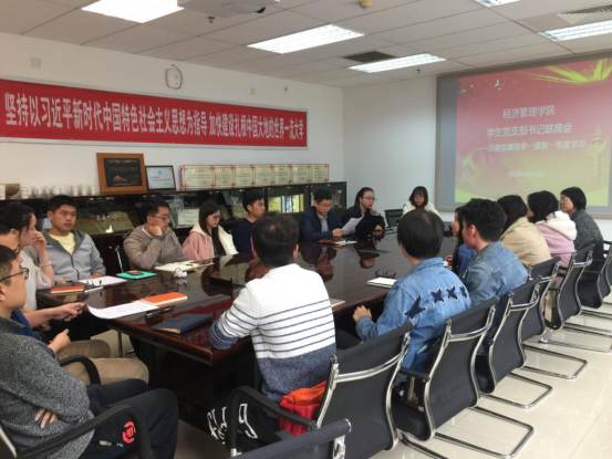 2019年3月14日,经管学院在A710召开学生党支部书记联席会,传达学院巡察整改反馈意见以及学校和学院2019年工作任务。研究生指导主任单伟出席并主持会议,学生党建辅导员张慧美及全体学生党支部书记参加了会议。