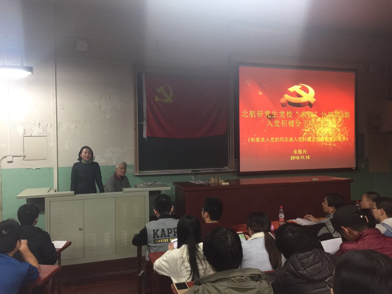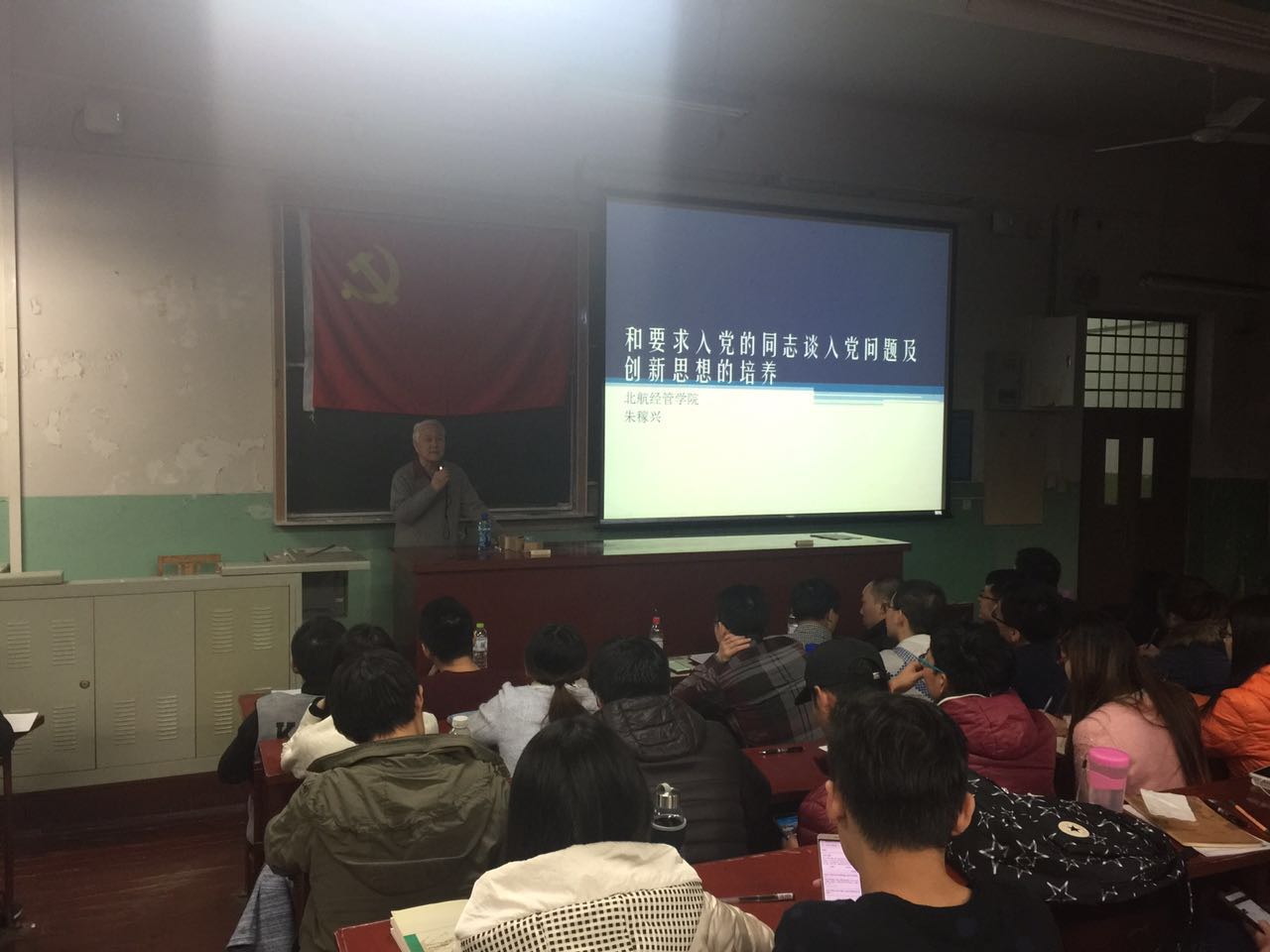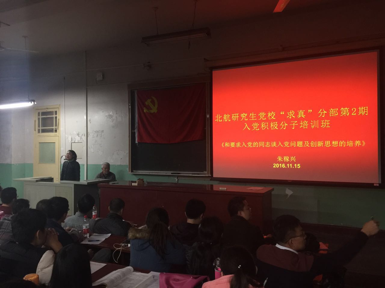 11月15日晚6点30分,北航研究生党校“求真”分部第2期入党积极分子培训班顺利召开,此次主讲嘉宾为经管学院退休老党员朱稼兴教授,培训主题为:和要求入党的同志谈入党问题及创新思想的培养。朱老师围绕关于入党动机、关于理想信念以及创新思想的培养等入党积极分子关心的问题为同学们一一进行了讲解。会议由北航经管学院研究生工作办公室衣萌老师主持。