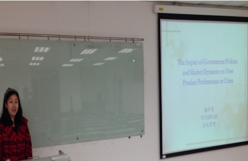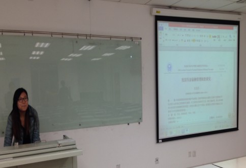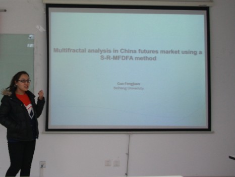 首先上台宣讲的是李迎君,她的题目是《我国导游薪酬管理制度研究》,文章采用定性的研究方法,通过文献研究,配合具体案例分析我国导游薪酬管理的现状、存在的问题以及产生原因,既而需要从薪酬制度入手,不断完善导游薪酬结构,建立科学的奖评机制,重视导游的日常培训和思想道德建设。还需要不断完善行业法规,加强日常监督管理,最终使旅游业能够健康稳定的发展。其次做出宣讲的是郭峰娟,她的论文题目为《Multifractal analysis in China futures market using a S-R-MFDFA method》,文章重点运用S-R-MFDFA方法对中国期货市场进行多重多形分析得出两个结论:1,SFE的铜期货市场存在多重多形标度行为;2, 当q比较大时,广义的Hurst指数较大,说明了铜期货的长程相关性强。最后一位宣讲者是杨冲青,她的题目是《The Impact of Government Policies and Market Dynamics on New Product Performance in China》,文章在前人开发的模型基础上重点研究政府政策和市场动态这两个因素对中国的新产品性能的影响。结果表明,政府的创新政策对于新产品开发和产品的竞争优势有直接和显著的影响,而市场动态对新产品开发过程无显著作用,但对新产品的竞争优势产生负面影响。同时政府的创新政策和市场动态可能会影响不同类型的企业的产品竞争优势。