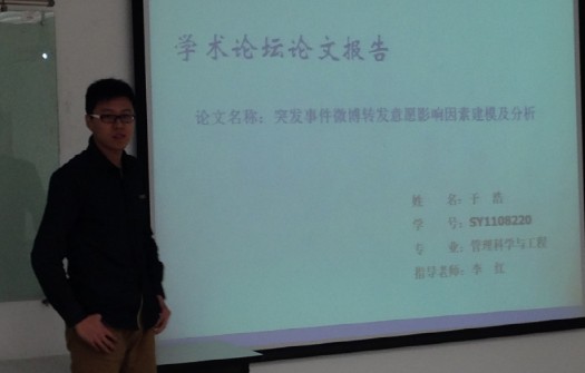 参加此次宣讲会的作者们都精心准备了他们的论文和PPT,宣讲会由李苍艳开场,她的论文题目是《Empirical Research on Critical Factors Affecting Employee Satisfaction Based on SEM》,文章从多个方面对联想集团的员工满意度进行了研究,并建模完成可靠性和适应程度分析,这一方法在参考员工满意度的管理企业方面有一定的可行性和实用价值。紧接着是于浩,他的论文题目是《基于结构方程的突发事件微博转发意愿影响因素建模及分析》,使用的基于结构方程理论对于提出的影响因素假设进行显著性检验,最终得到验证了3个假设不成立,而2个假设的正确性,并由此提出主要的影响个人转发意愿的影响因素是获得认同性和主观表达的意愿,这对于政府等应急管理的决策者了解突发事件发展的态势和公众的反应,从而对事件做出妥当地处置,具有十分重要的意义。宣讲会的最后一篇论文是来自李亚博的《我国银行业顺周期性的形成机理、表现及逆周期监管》,文章首先对金融系统顺周期性和银行逆周期监管的相关理论作简单评述;接着从内部因素和外部因素两个角度分析银行顺周期的形成机理,并在此基础上重点讨论我国银行业顺周期性的表现;最后对当前逆周期资本监管工具进行了总结。