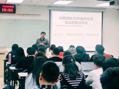 为了进一步推进学院学生就业工作,使学生了解行业发展形势、明确就业目标、增强学生的职业规划能力,2019年10月28日,学院特邀请北航招生就业处刘睿副处长,为我院带来“就业形势与就业政策”宣讲会。研究生指导主任单伟老师、职业发展中心叶老师以及2020届本科生和研究生共100余人参加了此次宣讲会。
