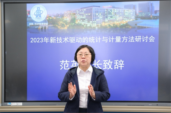经济管理学院院长范英教授对各位与会学者表示欢迎与感谢,表达了学院对研讨会的支持,并为研讨会致辞。她在致辞中表示,北航经济管理学院一直致力于推动多学科融合发展,统计与计量方法作为重要的基础学科,对于推动学院整体学科发展具有重要意义,希望研讨会可以促进多方学术交流,为统计与计量方法带来新的指导与发展,推动新方法的创新与应用。