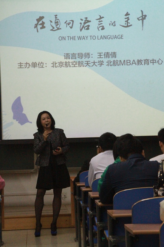 2015年10月17日,以倡导和谐社会沟通环境为主旨的讲座《在通向语言的途中》走进北京伊人99。在新主楼B101教室里,语言导师王倩倩做客MBA知行论坛,结合自己25年语言职业生涯,带来精彩主题讲座。MBA中心副主任李亚帅老师也亲临现场,为本场讲座预热,提倡大家注重语言沟通的艺术。