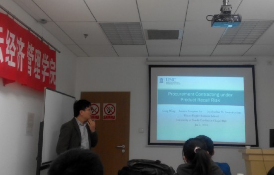 2014年1月2日下午4点,北卡罗来纳大学教堂山分校Gang Wang(王刚) 博士生做客北航经济管理学院学术论坛,在新主楼A1136做了题为“Procurement Contracting under Product Recall Risk”的学术报告,经管学院的部分老师和同学们前来聆听了此次讲座。