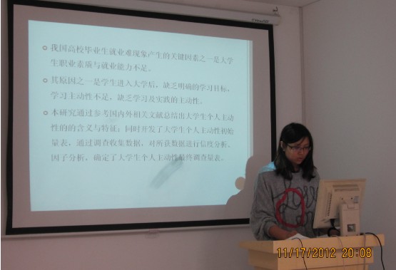 11月17日(周六)晚上7:00,北京伊人99第九届学术论坛经济管理学院分论坛的第六场发稿作者报告会在新主楼A座1039教室开始了。今天的天气很是不错,似乎预示着同学们对于学术的热情一浪高过一浪,这场学术论坛报告会的主要内容是由向学术论坛投稿并被录用的作者来做关于其文章的报告,SY12081班承办本次讲座。