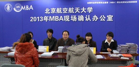 作为全国MBA综合改革试点院校的北航经管学院,为全面做好2013年MBA现场确认工作,基于专业化管理、人性化服务的理念,在总结前三年成功设立“北航MBA现场确认办公室”的成功经验基础上,北航MBA教育中心继续在研究生报考确认现场期间推出一系列人性化服务举措。11月初MBA教育中心在深入调研的基础上完成了现场确认期间的工作安排:10日至14日,中心主任及中心负责招生宣传老师们悉数在现场确认办公室办公,每天还有2—4名MBA学员到现场担当志愿者,共同为考生提供北航MBA招生政策咨询、2013年SMBA报名、宣传礼品派发、校友交流、休息休整等温馨服务,并推出了MBA知行论坛等系列活动。