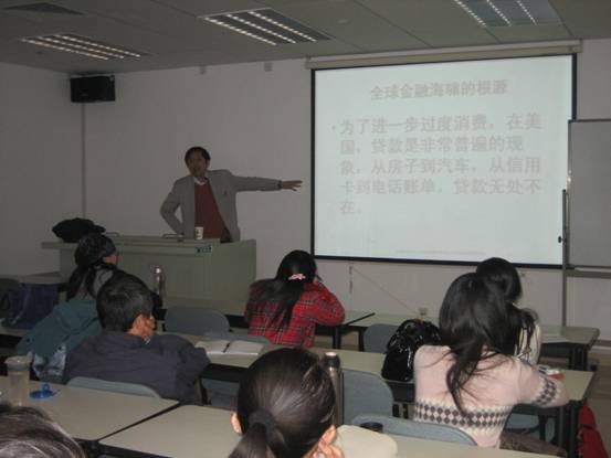 讲座围绕着此次由美国次级贷款所引发的次贷危机展开,任教授以通俗易懂的语言为大家介绍了从宏观经济角度来看此次金融危机的相关知识。整个讲座主要是有三部分内容,首先从全球金融海啸对中国的影响入手,任教授提到了此次次贷危机的债务特征,同时还以国际清算机构发布的数据作为佐证;其次任教授从2008中国的宏观经济走势为大家回顾了今年中国的经济现状,尤其提到了中国金融机构的损失并提供了很具体的各行业数据来佐证这个问题;最后的内容是我国宏观经济展望,任教授认为保障就业对中国具有很特殊的意义,并且提出应该重视中国股市在刺激内需中的作用。