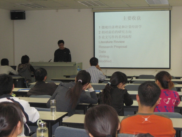 林忠国同学首先给大家带来了自己在香港的研究成果《股票价格的同步性》,并着重分析了股票会含有多少未来收益的信息。此外他还介绍了自己在香港的生活等方面的情况。