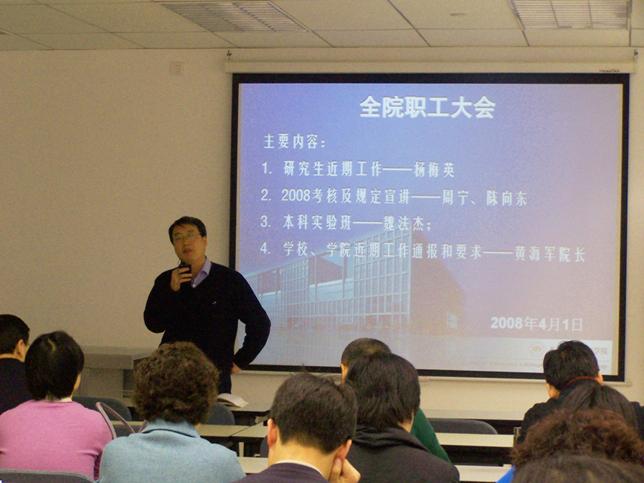 周宁副院长对我院2008年教师业绩考核体系做了相关说明,通报了2008年考核体系的制定步骤、修订原则及内容,并对学院近期的财务通知、流动人口普查、校内财务网使用、公共服务区设置等方面做了解释和说明,要求全院教职工严格遵守和执行学院的有关规定。