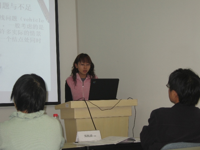 本次报告会的三位宣讲者是陈茂竹、刘晓靖和张国蕊同学,他们的论文分别从四川农业劳动力转移动因的实证分析、高校教学科研人员绩效评估系统分析与设计、用遗传算法解具有双向物流的VRP问题等方面对管理科学与工程领域的相关问题进行了研究。见解独到,勇于创新,并具有一定的实际应用性。