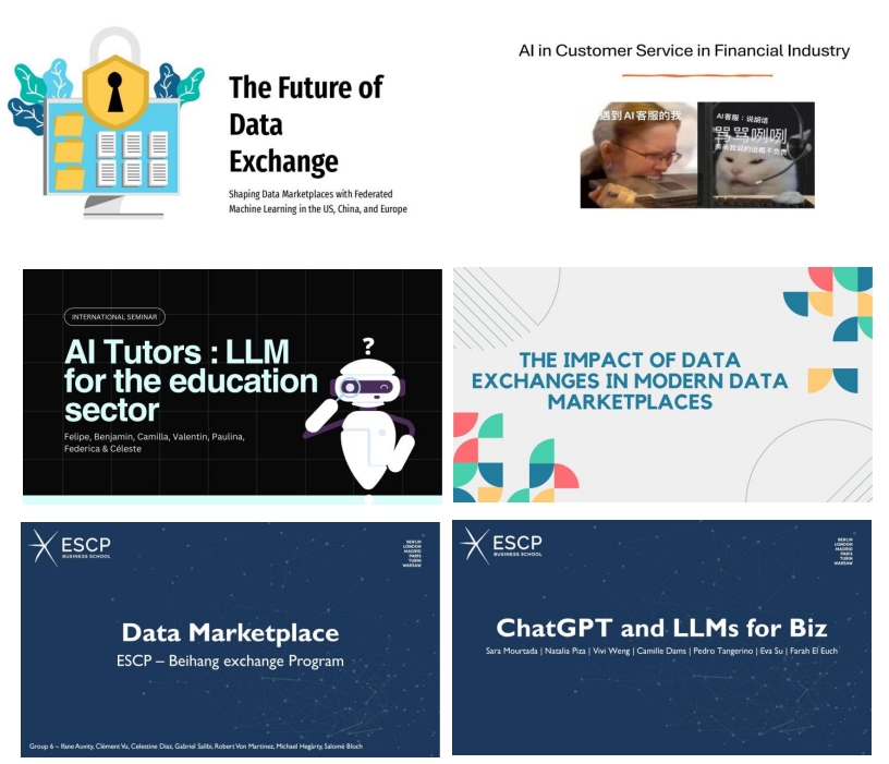 5月31日,ESCP的86名学生分成13组进行了阶段性学习成果汇报。从数据交换和数据市场到人工智能和大语言模型在金融、教育、商业、医疗领域的应用,再到中、西方大数据和人工智能产业发展现状的对比,都充分体现了参访学生对于人工智能相关前沿领域的深度思考。