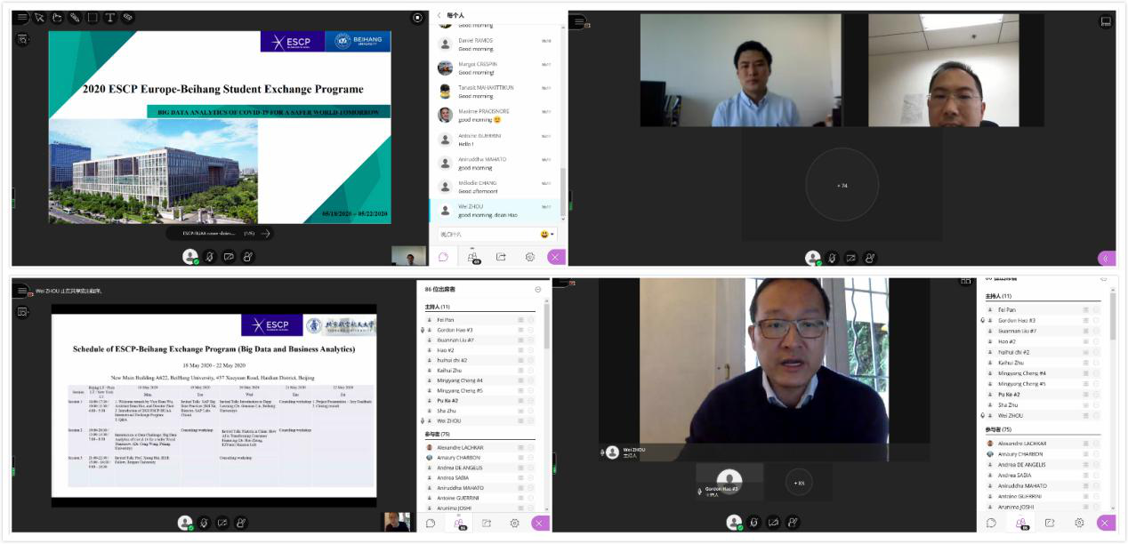 在新冠病毒全球肆虐、国际交流几乎中断的形势下,北京伊人99经济管理学院积极贯彻北航党委“坚持以人民为中心,发挥科研优势,坚决打赢疫情防控阻击战”的精神,联合ESCP欧洲商学院,不断开拓创新、充分协调各方资源,以“探索新冠肺炎大数据 共创美好世界新未来(Bigdata analytics of COVID-19 for a safer world tomorrow)”为主题,精心设计了此次线上国际交流活动。北航经济管理学院副院长吴俊杰教授和院长助理郝金星教授、ESCP欧洲商学院项目主任周炜教授和Louis-David Benyayer教授对该项目进行了统筹安排,刘冠男讲师、外事秘书朱凯慧等进行了精心组织,实验中心孟岩,程阳明进行了会议技术保障。