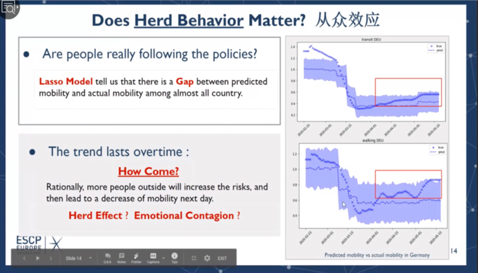 此次线上国际交流活动还进行了“新冠肺炎大数据”数据挑战赛,5天、13个小组、80名ESCP商学院国际学生积极参与并进行了线上答辩。学生通过综合应用课堂中学习到的机器学习、时间序列、计量经济、优化建模等方法,系统开展了Covid-19大数据的挖掘与分析,取得了丰硕的阶段性成果。这些成果大致分为三个方面。围绕疫情影响,研究了疫情对全球经济、比特币交易、失业率、社会不平等现象等的作用机理;围绕政府抗击疫情的措施,探究了居民对于政府措施的服从程度、措施实行的范围时长、不同国情导致措施的差异化等对于对病毒传播率、死亡率的影响;围绕疫情中的社会现象,指出社会中存在抗疫资源分配不平等、民众从众心理下的出行差异以及抢购、解禁后女性感染率上升等现象。此次在线数据挑战赛,也体现了不同文化背景下的思想交流碰撞。同学们纷纷表示此次线上挑战赛不仅开拓了自身学术视野、检查了自身学习效果,而且体验了自身研究成果所带来的丰收与喜悦。