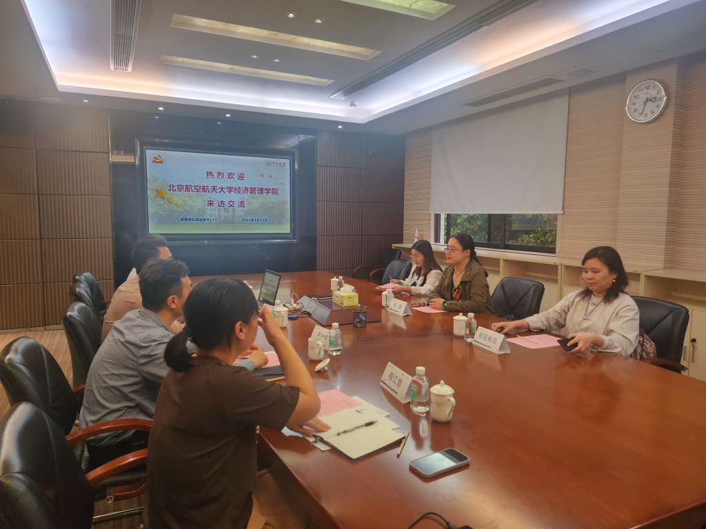 2023年4月24日下午,北京伊人99经济管理学院副院长牟晖带队前往中山大学管理学院开展工作交流。学院欧阳桃花教授,案例中心助理李莎,中山大学管理学院院长助理、教授汪林,校友工作办公室主任王远怀,专业学位办公室副主任李志明,案例中心助理、辅导员程江慧参加调研交流。双方就案例建设、会计硕士培养、校友工作、工商管理学科建设方面进行深入交流。