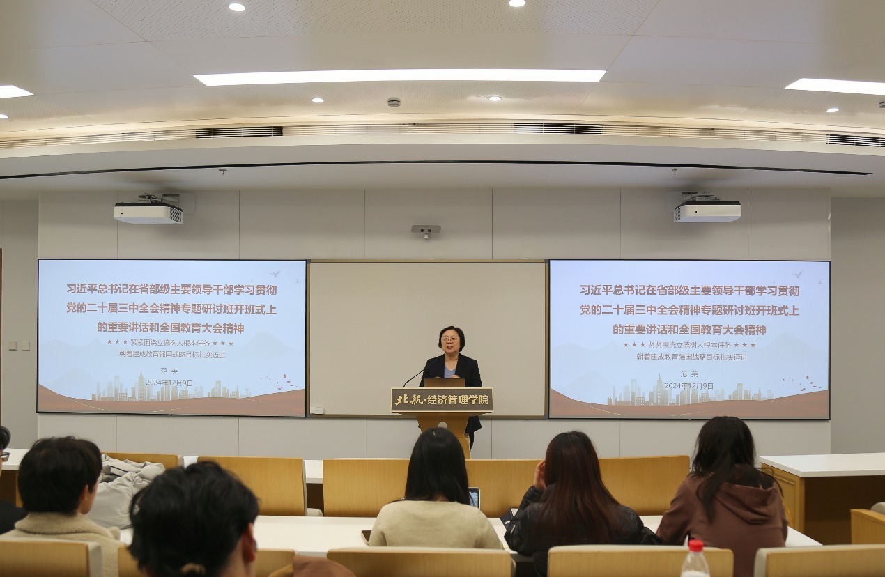 12月9日晚,经济管理学院范英院长为SY2208(一)、SY2208(二)和ZY2208(二)硕士研究生党支部讲《学习贯彻党的二十届三中全会精神及全国教育大会精神》专题党课。共30余名学生党员参加,会议由学院党务秘书朱凯慧主持。