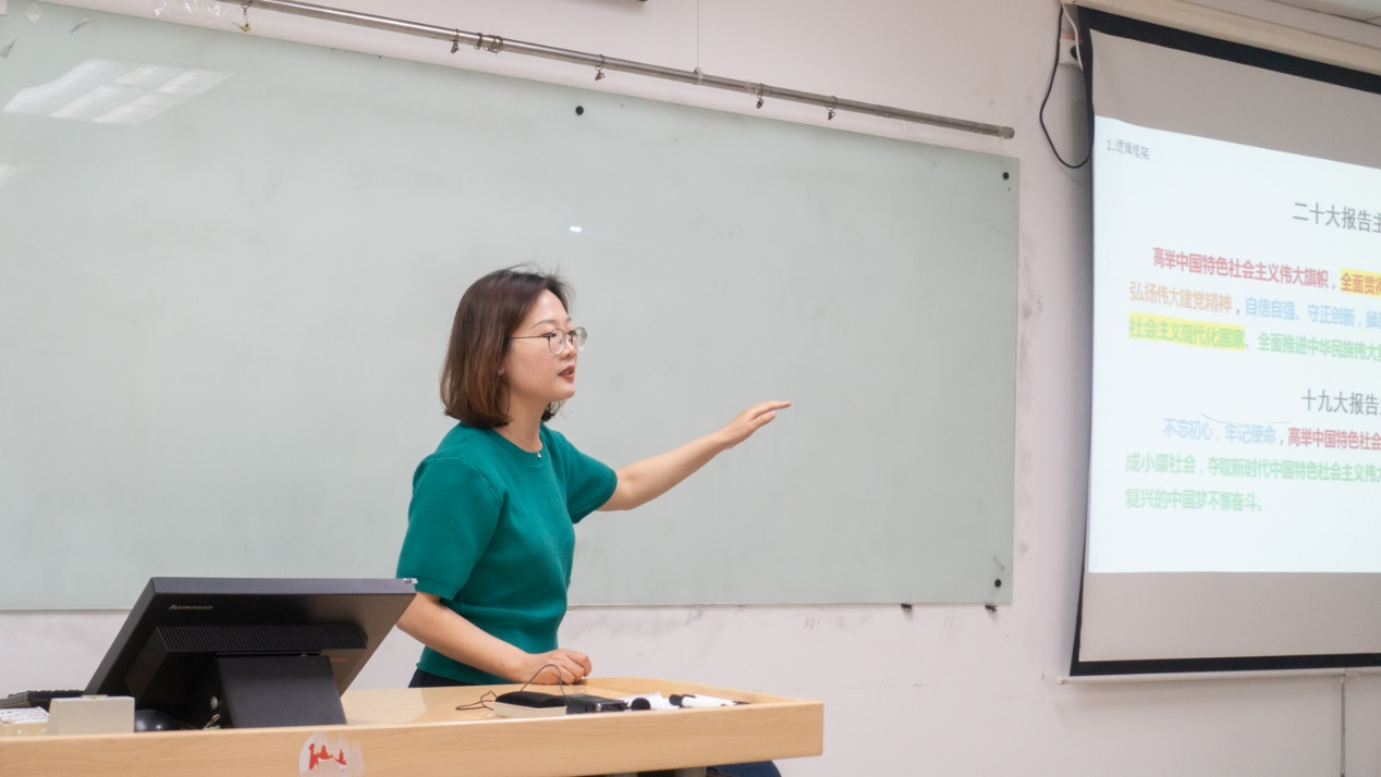 会议首先进行传达学习,马克思主义学院教师李雪姣就党的二十大报告逻辑框架与时代方位,详细解读了党的二十大报告主题“以旗帜为导向,以思想为引领,弘扬历史精神,开启时代行动,从阶段化任务走向伟大使命任务”,从回望光辉历程、展望光明未来、砥砺奋进前行三方面充分解读党的二十大精神。