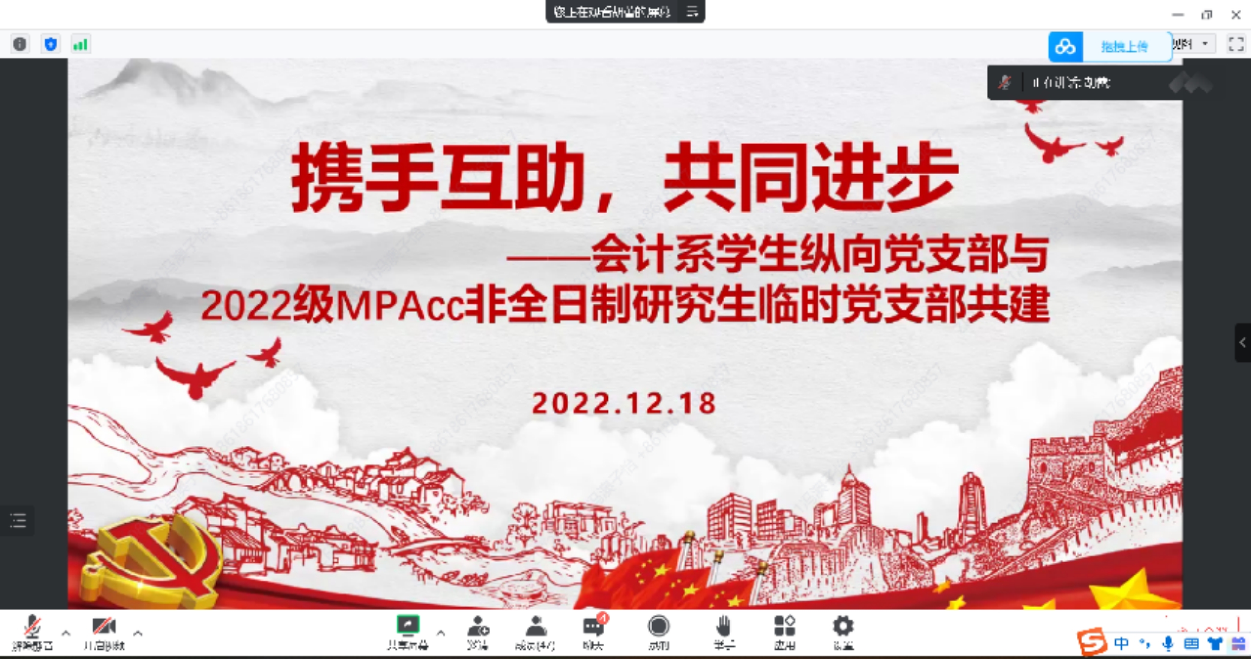 12月18日晚,北京航空大学经济管理学院2022级MPAcc非全日制研究生临时党支部与会计系学生纵向党支部通过线上方式举办了主题为“携手互助,共同进步”的支部共建活动。本次活动由会计系学生纵向党支部书记党胡蕾、2022级MPAcc非全临时党支部书记程思佳联合主持,两个党支部的全体学生党员、入党积极分子参加,经济管理学院党委书记郑海涛出席活动。