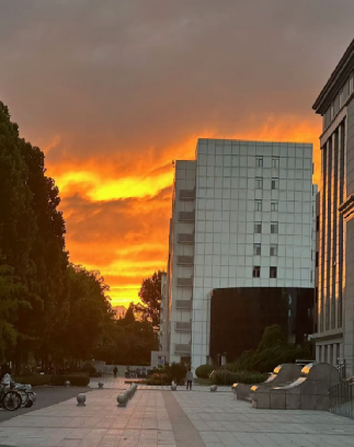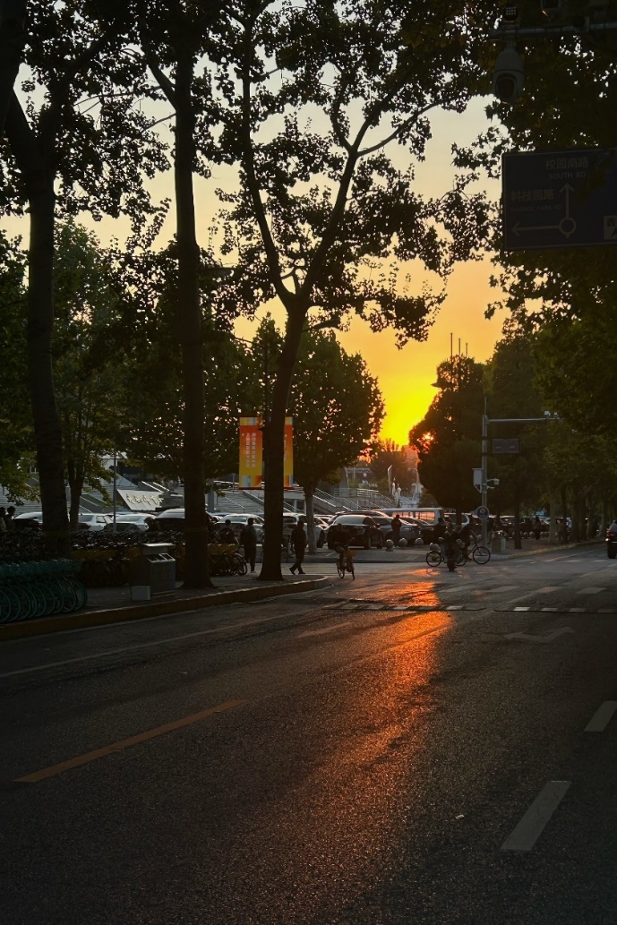 天际映金挂树梢,夕阳如诗洒满道,行道人影微风摇,校园黄昏静且妙。