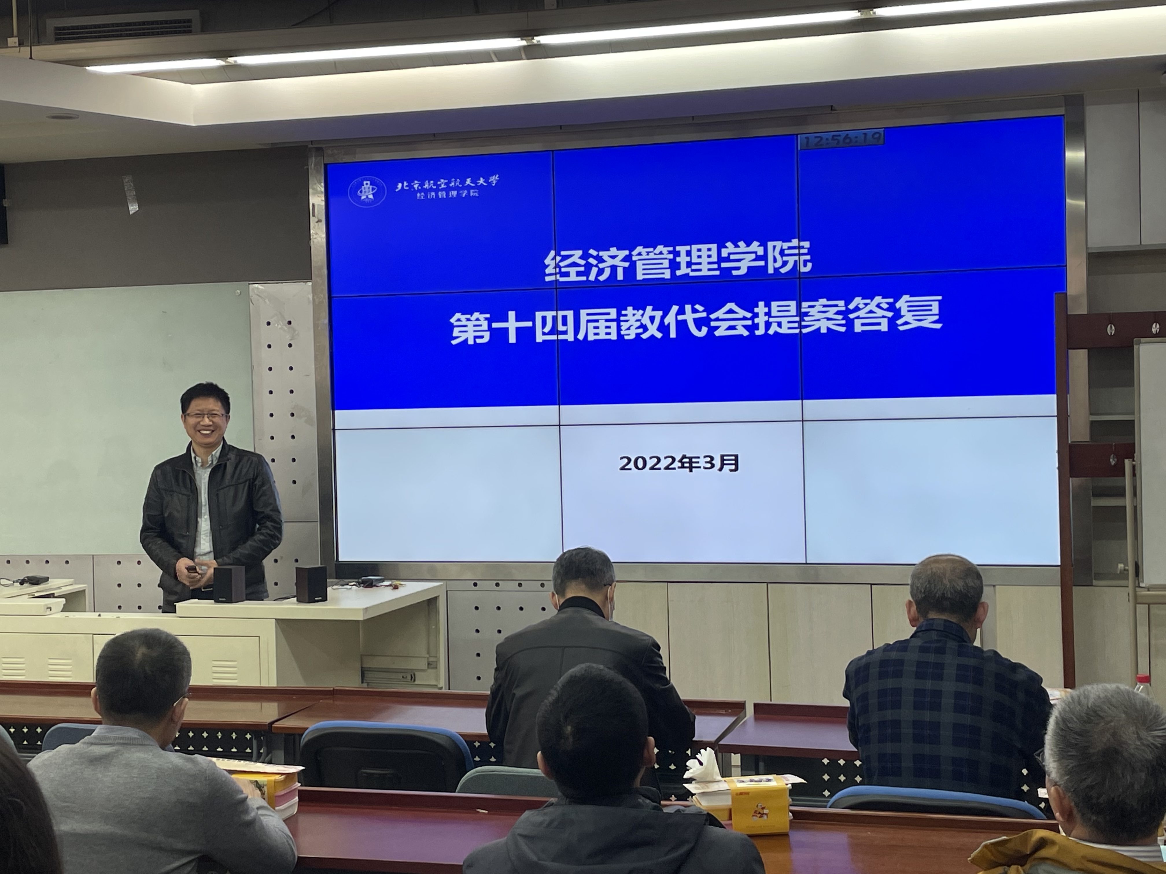 2022年4月1日中午,经管学院在新主楼A618召开了第十四届教职工代表大会提案答复会议暨财务预决算报告会。会议由学院党委书记郑海涛主持,共有三十余名教代会代表参加了此次会议。
