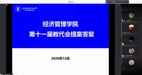 2020年12月1日下午,经管学院通过腾讯会议的形式召开了第十一届教职工代表大会提案答复会议。会议由学院党委书记刘志新主持,共有三十余名教代会代表参加了此次会议。