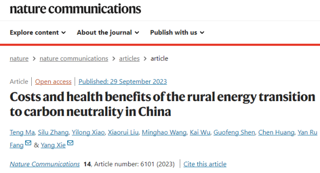 近日,北京伊人99经济管理学院谢杨课题组与合作者在我国农村现代能源转型助力实现碳中和目标的研究中取得新进展。研究成果以“中国农村能源转型实现碳中和的成本与健康效益分析(Costs and health benefits of the rural energy transition to carbon neutrality in China)”为题,于2023年9月29日发表于《自然∙通讯》(Nature Communications)期刊, 北京大学环境科学与工程博士生马腾为第一作者,北京大学博士后方艳茹与北航谢杨副教授为共同通讯作者。