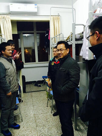 2014年11月26日晚20:00,经济管理学院党委副书记王喜忠老师赴沙河校区男生寝室对14级学生进行期中考前慰问,辅导员石晓倩和闫琦陪同。