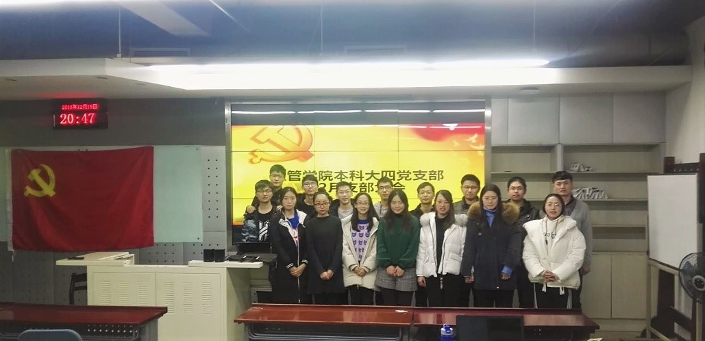 2018年12月15日19:00,经济管理学院本科大四党支部在新主楼A618举办2018年12月份支部大会。会议由1508第一党支部书记丁宁主持。大会第一项汇报大会人数并奏唱国际歌。大会第二项,以全国教育大会为主题进行党课展示与讨论。王劲齐小组回顾了全国教育大会的摘要和主要内容,并且介绍了前四次全国教育会议的历史和主题,而后提出了他们探讨的主题核心——“重点建设教师队伍”。这次的全国教育大会的九个坚持中,就包含了“坚持把...