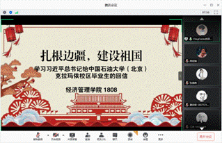 2020年7月11日-7月12日,经济管理学院1808大班各小班召开主题班会,学习习近平总书记给中国石油大学(北京)克拉玛依校区毕业生回信。同学们认真学习回信精神,学习中国石油大学(北京)克拉玛依校区毕业生到边疆基层工作的选择。通过互相交流等方式,激励同学们将个人的理想追求融入党和国家事业之中,为党、为祖国、为人民多作贡献。班主任老师、辅导员等参与了主题班会。各班以不同的视角学习了回信精神,以不同的角度表达自...
