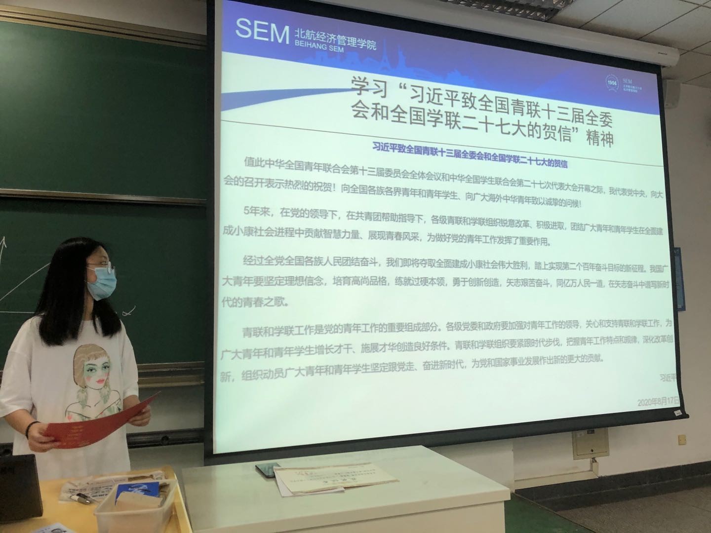 为深入贯彻习近平总书记对于青年工作的重要思想和关于教育的重要论述,经管学院2018级本科生以小班团支部为单位组织开展了学习“习近平总书记致全国青联十三届全委会和全国学联二十七大的贺信”精神的专题活动。9月16日,180811团支部和180812团支部一同学习习近平总书记的贺信,180812班团支书蒋语然为大家讲解了贺信的精神,她表示习近平总书记的贺信是给广大青年学子的强心剂,鼓励大家尽快投入到学习和工作中,实现人生理想...